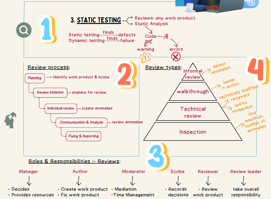 Static Testing (정적 테스팅)이란 소프트웨어 개발 생명주기의 초기에, 코드를 포함한 프로젝트 문서(Work Products)를 실행하지 않고 분석하여 결함을 찾아내는 테스트 활동입니다.