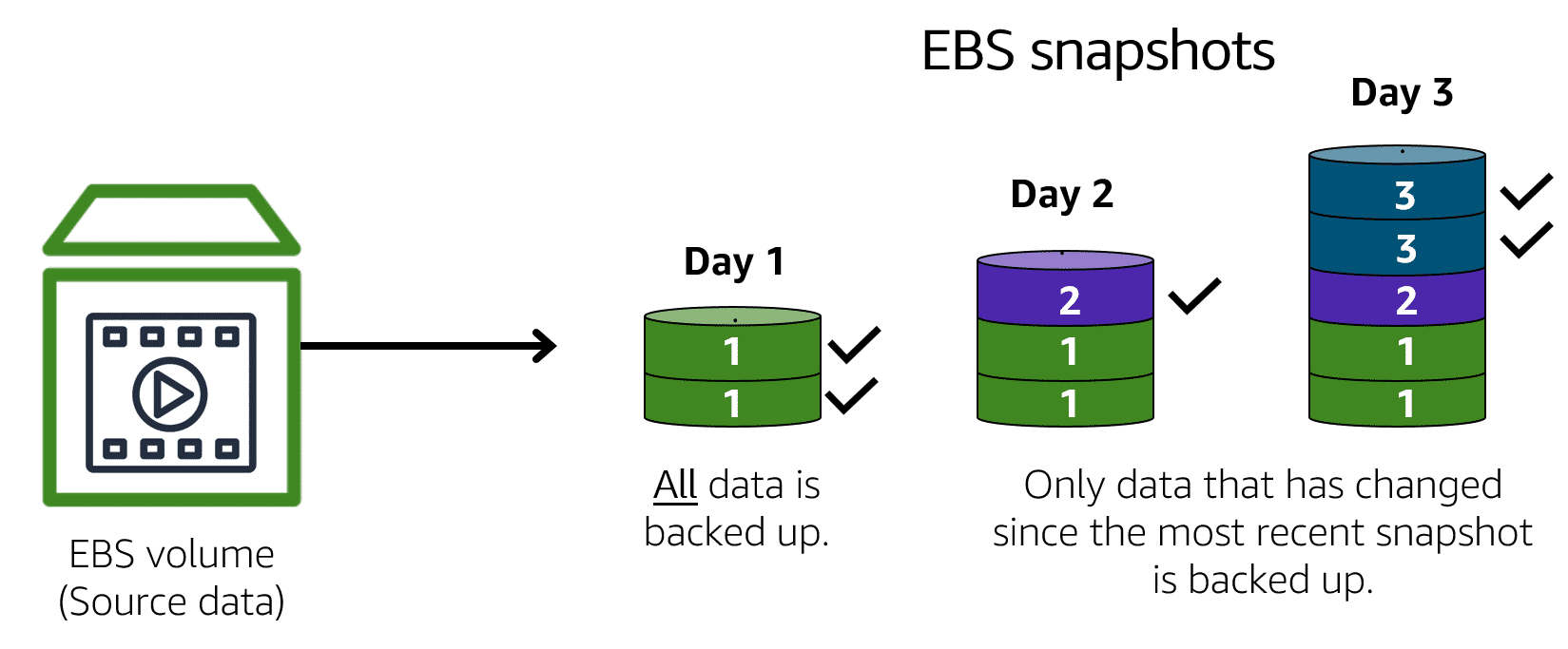 EBS 스냅샷은 증분 백업입니다. 즉, 볼륨의 첫 번째 백업은 모든 데이터를 복사합니다. 이후 백업의 경우 가장 최근 스냅샷 이후 변경된 데이터 블록만 저장됩니다.